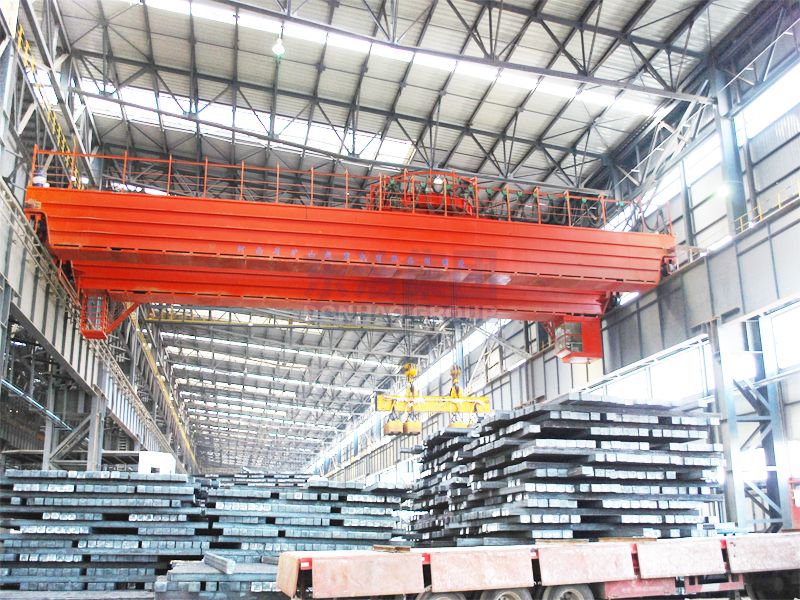 Used for transporting black metals such as long slabs and bars. Rotation can be achieved in two forms. One form is the hanging beam rotation, which is a double-layer structure. The upper hanging beam is wrapped with a steel wire rope through a pulley system, and the lower hanging beam is equipped with multiple electromagnetic suction cups or clamps, which can rotate a certain angle with the driving mechanism. Another form is the rotation of the trolley, which is a double-layer structure. The upper trolley is equipped with a lifting mechanism, and the lower trolley is a running trolley with a circular track laid on top. The upper trolley can rotate along the circular track.