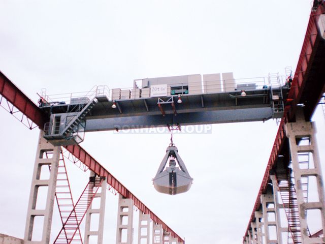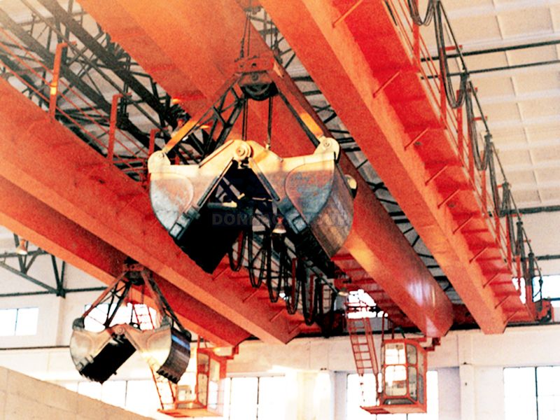 The grab bridge crane is mainly composed of a box shaped bridge, a grab trolley, a large vehicle operating mechanism, a driver's cab, and an electrical control system. The retrieval device is a grab bucket.